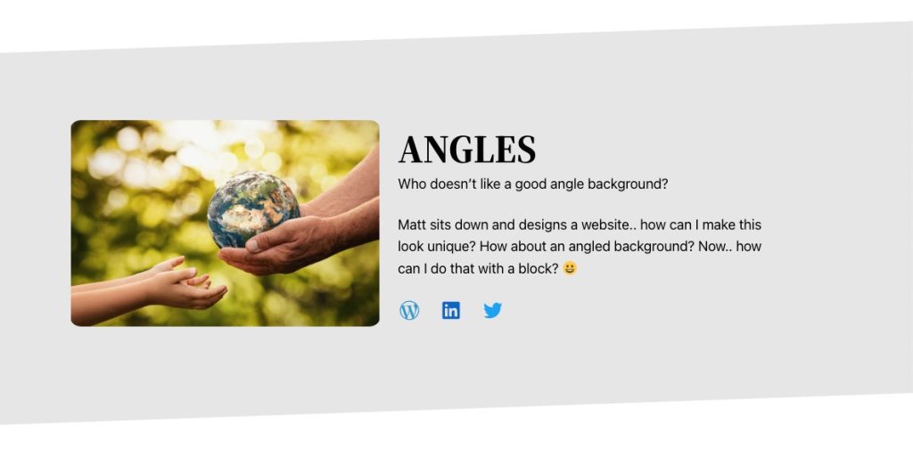 Angles! Who doesn’t like angles? This is simply an Angled Background column that can house any group of blocks. It’s just a nice design element I like to use in my website designs and thought I would share with you!