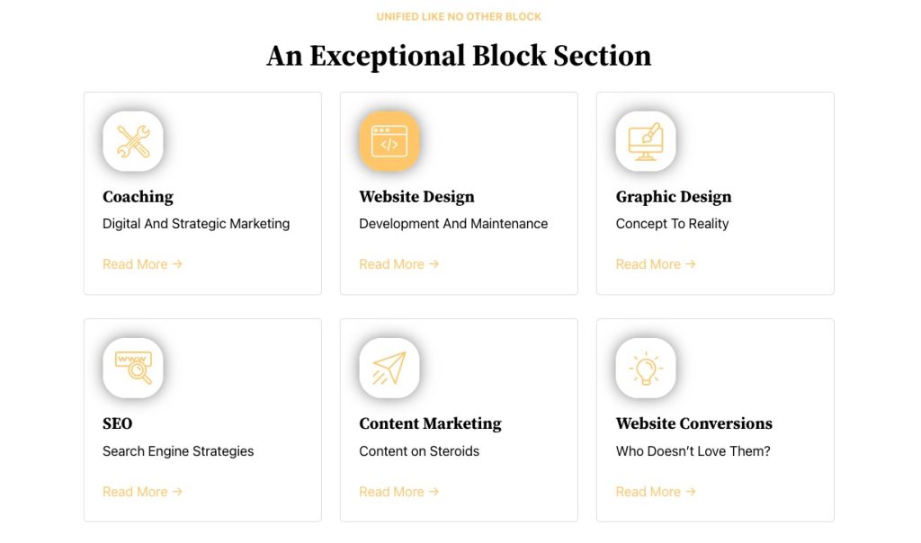 Instead of trying to replicate these layouts from scratch through trial and error, you can literally drop one of these on any page that supports blocks, drop in your content, DONE!