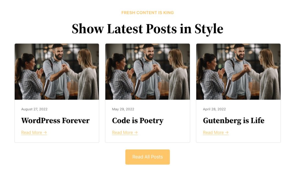Heading, Subheading, Media, Titles, Descriptions and Read More link blocks are all ready upon creation!